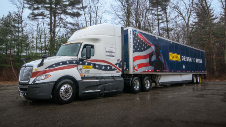 This year, J.B. Hunt will deliver 32 loads of wreaths to cemeteries nationwide, including Abraham Lincoln National Cemetery, Dallas-Fort Worth National Cemetery, Dayton National Cemetery, Fayetteville National Cemetery, Georgia National Cemetery, Marietta National Cemetery, and Salisbury National Cemetery, among others. J.B. Hunt has customized 11 tractors and 4 trailers with a military-themed wrap to complete the delivery.